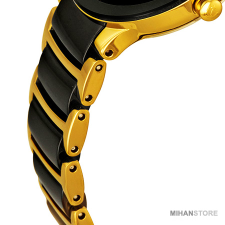 ساعت مچی Rado مدل Centrix دارای قاب استیل با پوششی از استیل طلایی رنگ و بند استیل طلایی است که سرامیکهای مشکی درون بند آن قرار داده شده است. صفحه نمایش این ساعت به رنگ مشکی ساده ، نمایش آنالوگ، عقربه های طلایی بوده و مارکرهای الماس به جای شماره های 3،6،9 و 12 جایگذاری شده است. قاب پشتی آن از جنس استیل و بسیار مستحکم است. همچنین قطر صفحه نمایش 3.2 سانتی متر میباشد. این ساعت با طراحی زیبا و شیک خود توانسته نظر مردم جهان را به خود جلب کند. ساعت Rado بسیار خوش ساخت و با کیفیت تولید شده است، کیفیتی که با بستن ساعت روی دستتان متوجه آن خواهید شد.