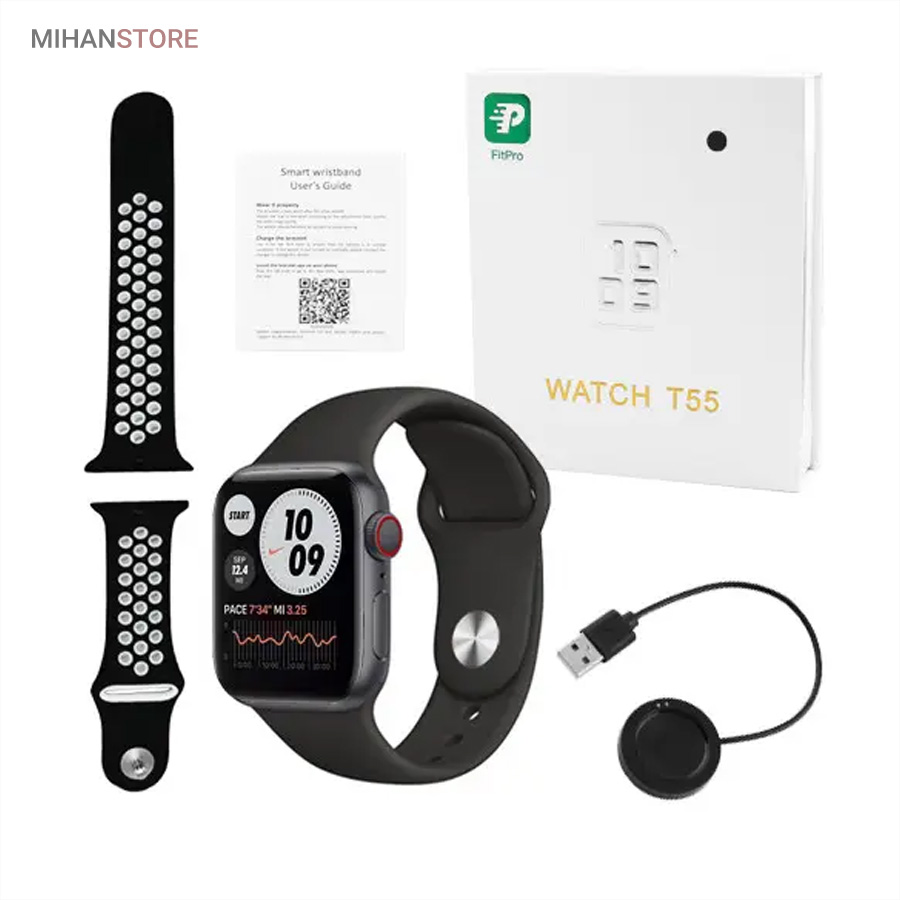 این ساعت با استفاده از اپلیکیشن fitpro به گوشی متصل می گردد. برای اتصال کافی است برنامه fitpro را نصب کرده و وارد بخش Set بشوید و بر روی Bind devices بزنید و از روشن بودن ساعت اطمینان حاصل کنید. به صورت خودکار ساعت را پیدا کرده و کافی است فقط آن را انتخاب کنید. در بخش Set، Message Push به برنامه هایی که تمایل دارید به شما آلارم بدهند اجازه دسترسی بدهید. همچنین به قسمت تنظیمان گوشی خود و سپس برنامه ها بروید و در برنامه fitpro به قسمت هایی که تمایل دارید نیز اجازه دسترسی بدهید. ساعت T55 دارای دو کلید کناری چرخان و فشاری می باشد. کلید چرخان فقط در حالت فشاری کار کرده و حالت چرخان آن هیچ گونه عملیاتی انجام نمی دهد. با استفاده از حالت فشاری کلید چرخان می توانید وارد منو برنامه ها شوید و با دوبار کلیک بر آن استایل منو را تغییر دهید. با استفاده از کلیک فشاری می توانید ساعت را خاموش و روشن نمایید. ساعت T55 در هنگام نمایش زمان، اگر دست را بر روی آن به سمت چپ و راست بکشید تم های آن تغییر می کند. از امکانات این ساعت می توان به گام شمار، کرنومتر، میزان ضربان قلب، صفحه شماره گیر، پخش موزیک و قبل و بعد کردن آهنگ، قابلیت مشاهده تماس و پیام ها، پشتیبانی از زبان فارسی البنه لازم به ذکر است در تنظیمات منو، زبان فارسی پیش فرض موجود نیست ولی شما می توانید پیام فارسی را مشاهده کنید. پایش خواب، پیدا کردن گوشی توسط ساعت و بالعکس، نمایش آب و هوا، تنظیم مدت روشن بودن صفحه نمایش حداکثر تا یک دقیقه، حالت های مختلف ورزشی، دارای ویبره (لرزش)، داشتن حالت مزاحم نشوید، روشن کردن صفحه نمایش هنگام چرخاندن مچ دست، استفاده از بلوتوث ورژن 4.0 و اتصال به اندروید و IOS را نام برد.