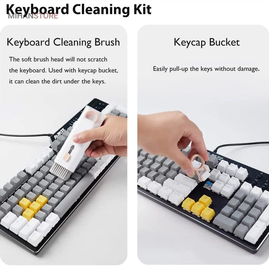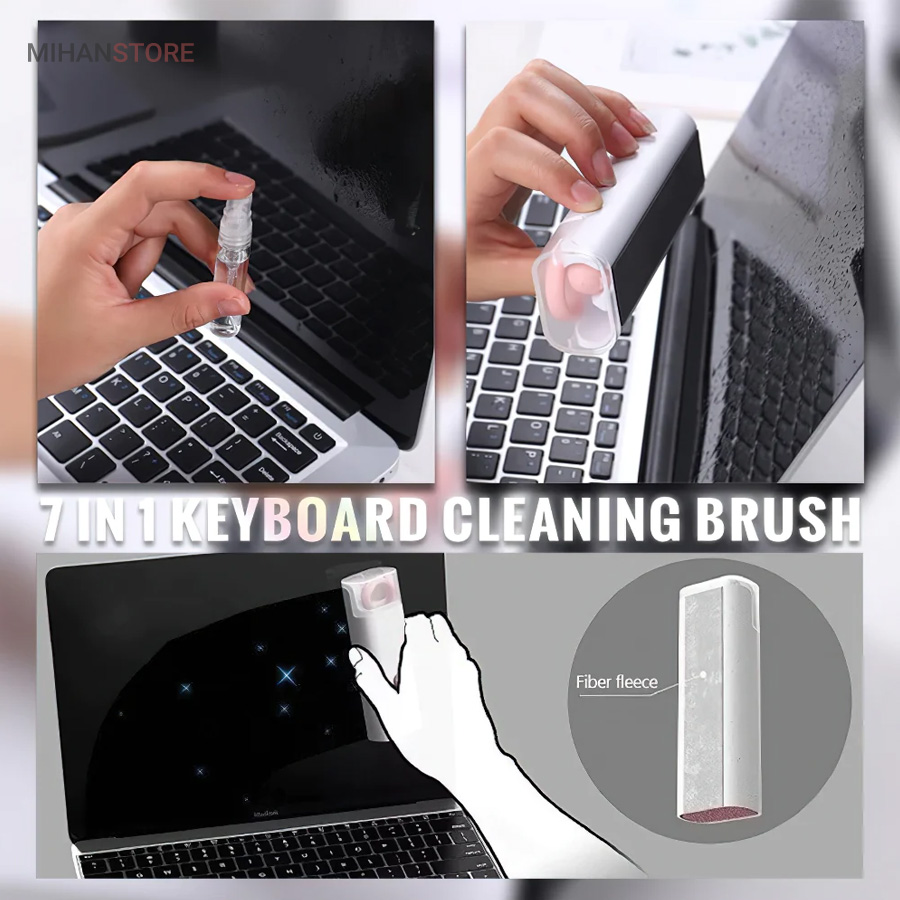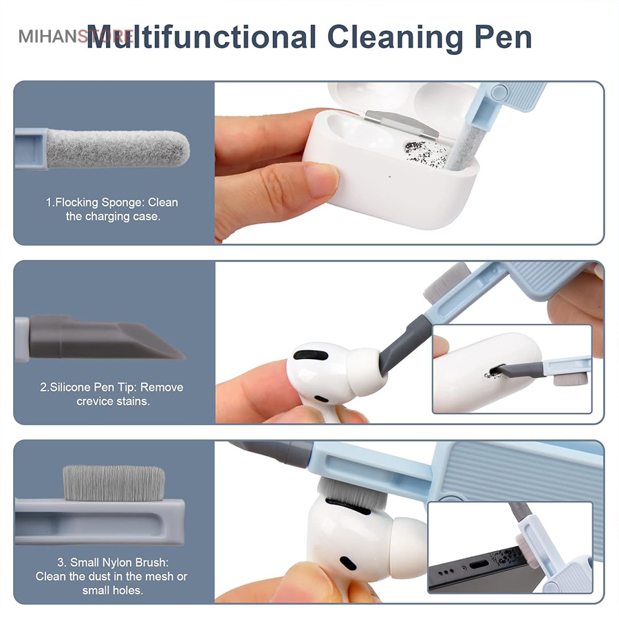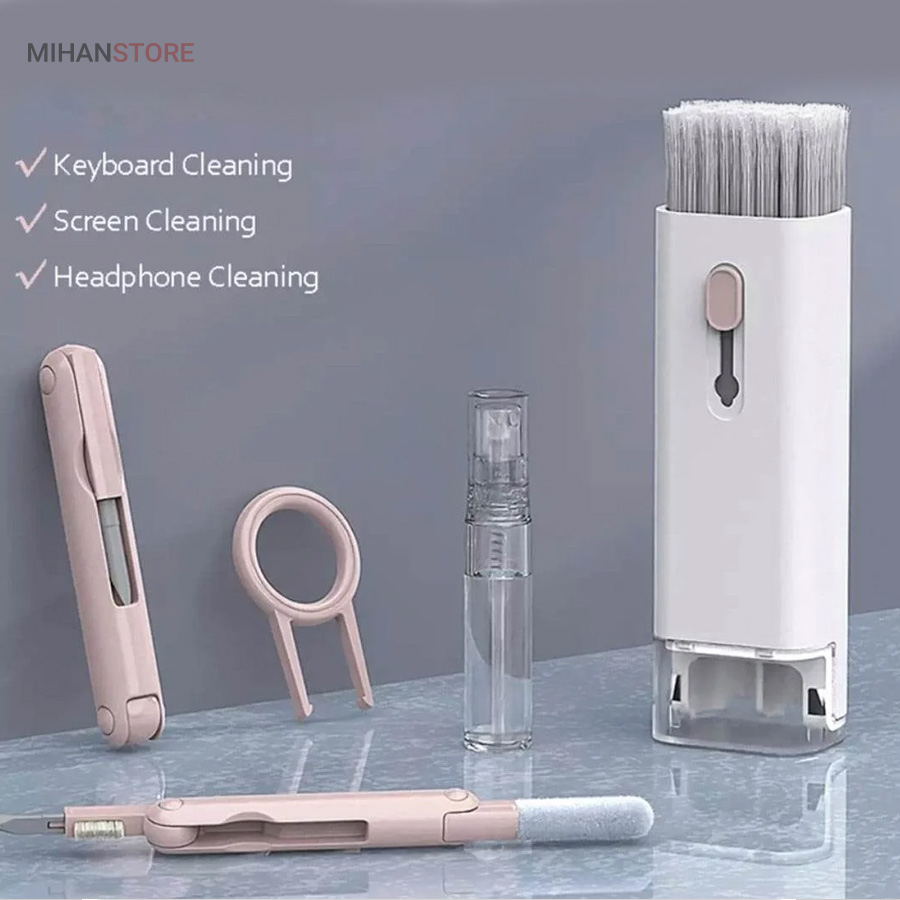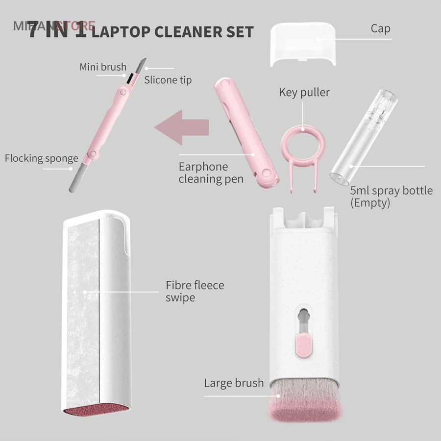 این کیت تمیزکننده 7 کاره شامل 1 برس بزرگ با تراکم بالا، 1 عدد پد تمیز کننده فیبری (مخصوص سطوح مانند مانیتور) ، 1 قلم تمیز کننده گوشی (شامل نوک فلزی، اسفنج و مینی برس با چگالی بالا)، 1 عدد کلیدکش کیبورد و 1 بطری اسپری می باشد. این سرویس پاک کننده چند منظوره می تواند هر خواسته شما را برای تمیز کردن وسایل الکترونیکی برآورده کند. اولین ابزار یک خودکار تمیزکننده تاشو با نوک سیلیکونی، برس کوچک سخت و اسفنج جمع‌کننده کثیفی ها ، مناسب برای تمیز کردن ایرپاد و سایر هدفون‌ها یا هندزفری ها. نوک سیلیکونی برای تمیز کردن لکه های شکاف است. دومین ابزار برس کوچک برای تمیز کردن گرد و غبار سطوح عمیق و اسفنج دسته دار برای تمیز کردن حفره های کیس شارژ  ایرپاد ها می‌باشد. ابزار سوم تمیز کننده لپ تاپ، رایانه، تبلت و صفحه کلید می باشد کافیست برس نرم بزرگ را بکشید تا گرد و غبار روی رایانه، لپ تاپ، تبلت و صفحه کلید پاک شود. و همچنین می توانید از کلیدکش کیبورد جدا کردن کلیدهای صفحه کلید مکانیکی برای انجام این کار استفاده کنید. ابزار بعدی تمیز کننده مانیتور، صفحه نمایش، دوربین، ساعت و تلویزیون میباشد: در کنار یک بطری خالی اسپری 5 میلی‌لیتری، مایع تمیزکننده یا آب را درون بطری قرار می‌دهید و از صفحه فیبری برای تمیز کردن صفحه‌های مختلف استفاده می‌کنید. به عنوان مثال صفحات نمایش ، تلویزیون، ساعت، دوربین و غیره.اندازه جمع و جور و سبک وزن: 7 ابزار تمیز کردن کامپیوتر به طور مرتب در یک جعبه مستطیلی قرار گرفته اند. اندازه کیت پاک کننده فقط 4.88 * 1.73 * 1.18 اینچ و وزن آن تقریبا 80 گرم است. برای سفر به اندازه کافی کوچک است و می توانید آن را حمل کنید. در همین حال، شما همچنین می توانید هر ابزار تمیز کننده ای را به طور جداگانه بیرون بیاورید.