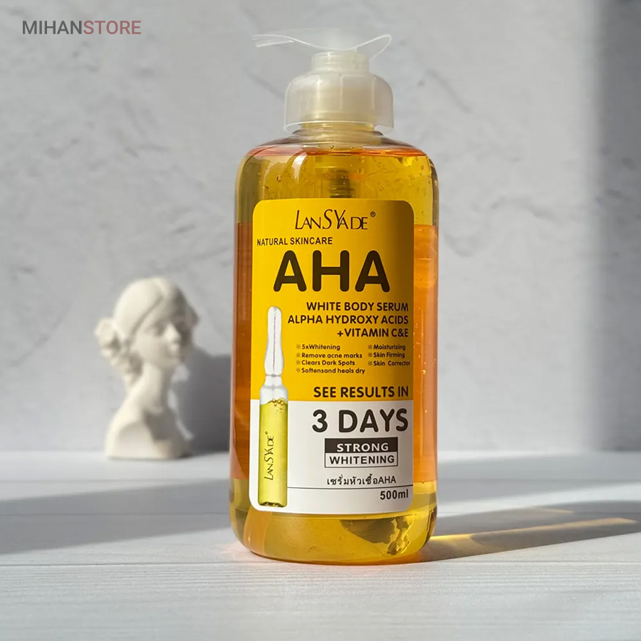 سرم روشن کننده بدن aha به تدریج آثار باقیمانده از آکنه و لکهها را محو کرده و پوست را صافتر نشان میدهد.