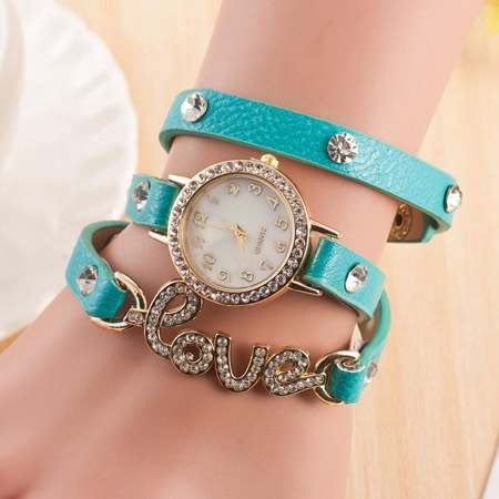 ساعت زنانه نگین دار طرح Love دارای طراحی بی نظیر و خلاقانه ای بوده و توانسته است با عرضه خود به بازار طرفداران بی شماری را در سراسر جهان جذب کند. این ساعت دارای بند چرم و نگین های درخشان می باشد که مانند یک دستبند به صورت دورپیچ روی دست خودنمایی می کند و نوشته یا همان پلاک Love آن، زیبایی این محصول را دو چندان میکند. این ساعت در رنگ بندی های مختلف با کیفیت فوق العاده بالا همراه با 6 ماه گارانتی تعویض عرضه می شود. هم اکنون می توانید این محصول را با قیمتی استثنایی از فروشگاه میهن استور سفارش دهید. جهت انتخاب رنگ این محصول، هنگام تکمیل فرم سفارش می توانید رنگ مورد نظر خود را در قسمت پیغام ذکر نمایید.