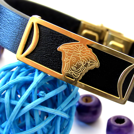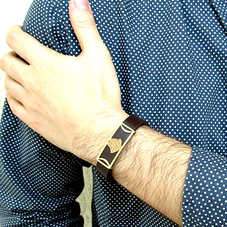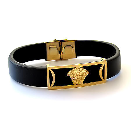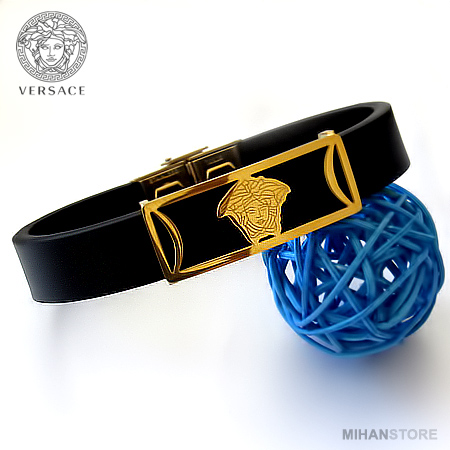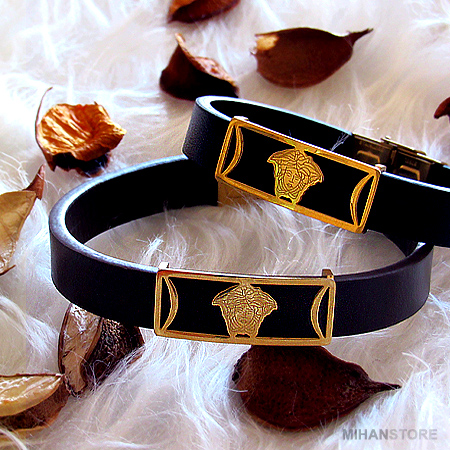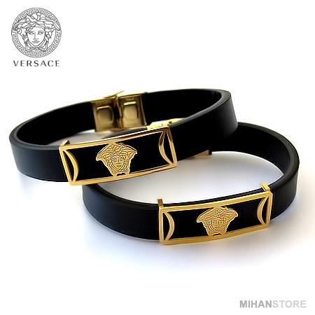 دستبند چرمی طرح ورساچه با دو رنگ قهوه‌ای و مشکی و پلاک نازک طلایی ورساچه  نمونه‌ای از زیورهای ساده و در عین حال پرطرفدار از جانب آقایان و خانوم ها است که با اکثر رنگ‌های لباس همخوانی داشته و در عین حال متفاوت دیده می‌شود. این دستبندها مناسب ترین هدیه برای جوانان شیک پوش است.